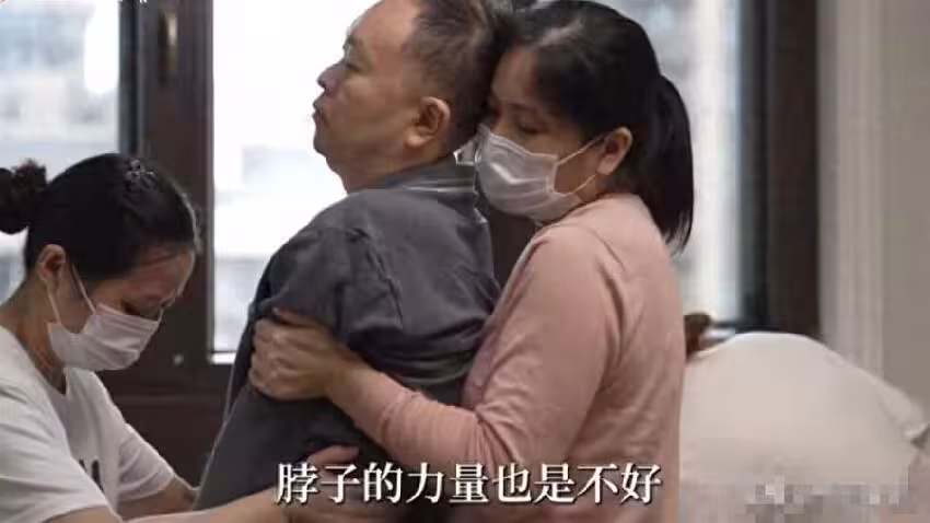 在前不久的訪談影片里,護工正用針管給蔡磊餵了增稠劑的流食。