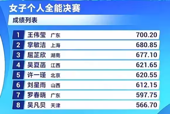 東道主廣東隊選手王偉瑩以700.20分的成績奪得金牌,上海隊選手掌敏潔以680.85分獲得了銀牌,銅牌被湖南隊選手屈芷欣獲得,排名4到8位的分別是江西選手吳夏菡、北京隊選手許一瑾、山西隊選手劉星雨、廣東隊選手羅春曉和天津隊選手吳凡貝。