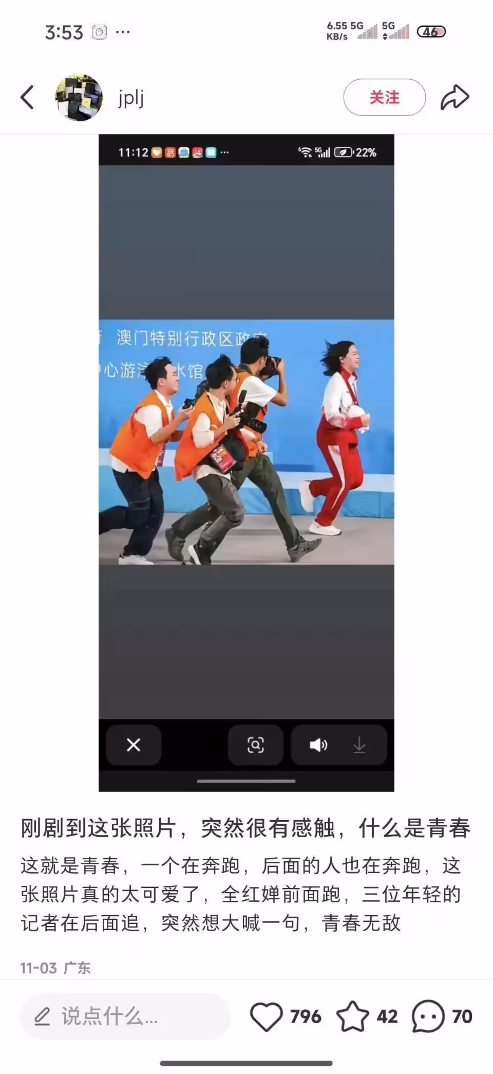 B面,是「生活家全紅嬋」。 鄰家小妹全紅嬋的舞台是熱鬧的賽場邊、是師兄信賴的目光里。她的「任務」是笨拙又真誠地抱好懷裡的娃娃,是奪冠後像風一樣自由地奔跑。那是一種動人的「輕」,輕如呼吸。