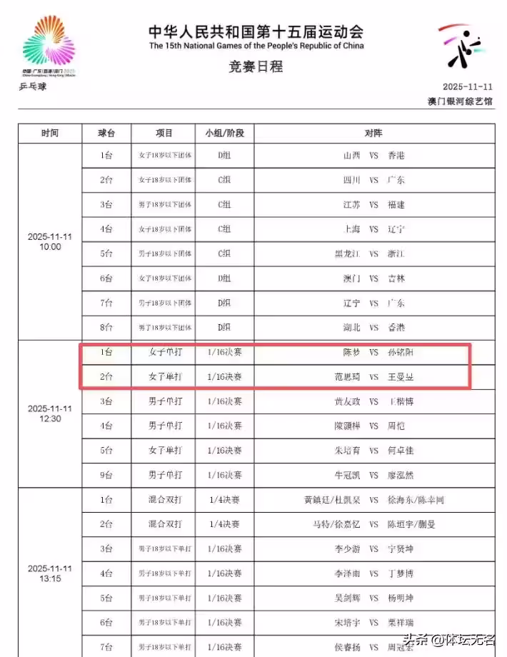 調整!11月11日央視直播全運會桌球有變,陳夢、鰻魚、劉詩雯出戰