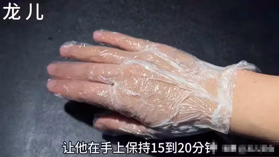 經過15分鐘之後,我們現在把手套去掉,接著再用另一隻手輕輕的揉搓一下,將手上殘留的部分讓手再一次充分的吸收一下,順便也給我們的手做了一個按摩。