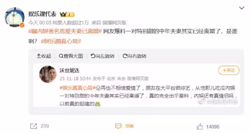 然而中國網絡上18日突然出現一則爆料,稱演藝圈中「一對特別甜的中年夫妻其實已經離婚了」,讓消息人士震驚到直呼「真的完全出乎意料!」由於線索提到「特別甜」、「中年夫妻」,讓不少人瘋猜講的就是唐嫣與羅晉。