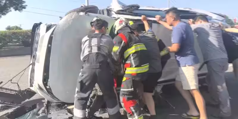 休旅車自撞路樹翻「3圈半」卡路中 1家4口傷送醫