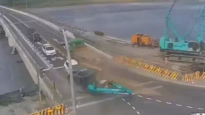 拖板車轉彎怪手重摔!13噸鋼鐵猛獸墜地 嚇壞後車急煞
