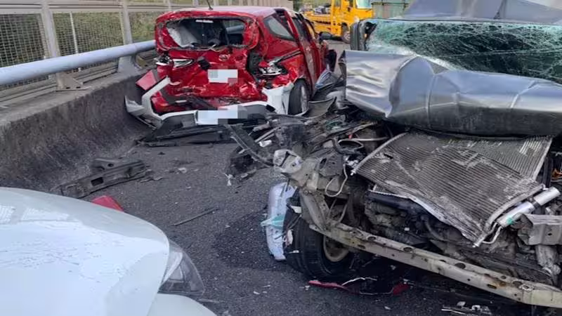 一起嚴重的七車連環交通事故於27日早上8點多發生在國道三號北向100.6公里新竹路段,造成7人受傷。事故起因是一名64歲王姓男子駕駛大貨車行駛在外側車道時,疑似未注意前方車輛回堵且未保持安全距離,撞上30歲卓姓男子的車輛,並進一步推撞前方5部車。現場一片混亂,車輛嚴重毀損,保險杆掉落、車門凹陷,地面散落大量車殼碎片,警方與拖吊車人員迅速到場協助指揮交通。
