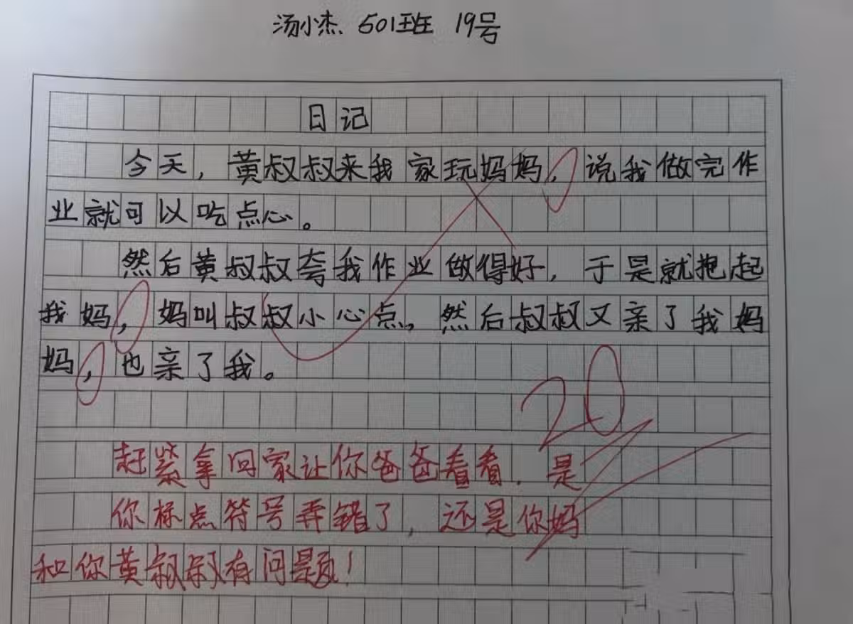 國小生在日記上寫著:「黃叔叔來我家找玩媽媽,還親了我媽媽」! 爸爸看了兩遍後「笑到嘴開開」