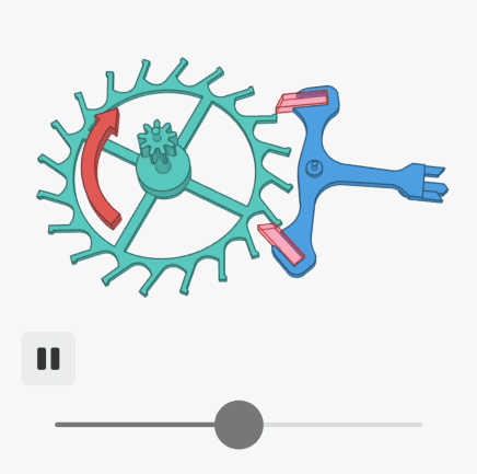 我們可以從下圖中看到這種交互的細節,這個機制可以通過簡單地將擒縱叉從一側移動到另一側來控制擒縱輪的旋轉。在下面的演示中,發條盒上滿鏈後,通過齒輪系試圖旋轉擒縱輪,而使用兩個按鈕可以切換擒縱叉的位置: