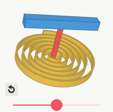 在機械錶中,我們最終希望通過齒輪旋轉帶動指針指示時間,因此扭簧提供的旋轉運動特別有用。機械錶中使用的彈簧具有稍微複雜的形狀——您可以在下面看到它處於放鬆狀態的樣子。拖動滑塊時,它會壓縮纏繞在一起積蓄能量,一旦鬆開,它就會恢復到原來的形狀: