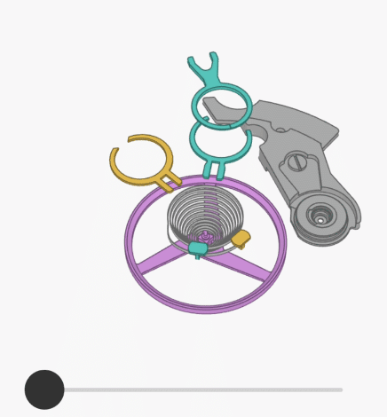 請注意,擺輪遊絲非常精密,這是手錶保持精準的核心部件。黃色組件(遊絲外樁)和青色組件(遊絲內樁)都可以調節擺輪的參數。讓我們看看它們是如何工作的: