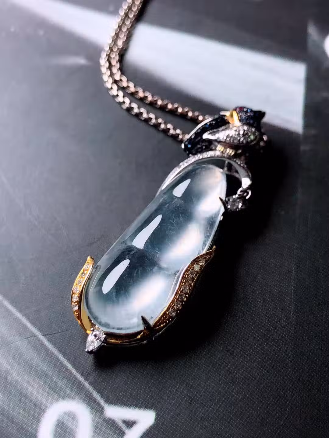無色翡翠種質極佳,整體剔透盈潤,而且內部結構緊密細緻,沒有外來致色物質滲入,因此顏色表現為無色透明,例如無色玻璃種翡翠。