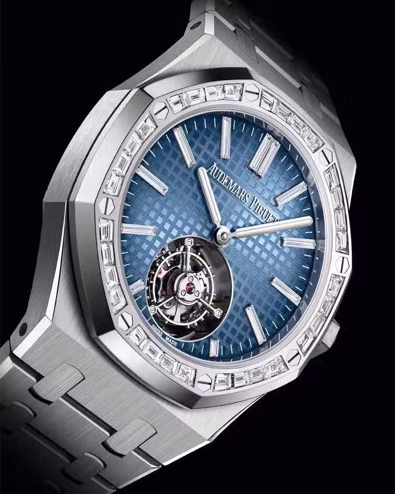 這款陀飛輪腕錶特別版集制表絕技與美鑽鑲飾於一身。搭載愛彼最新一代的自製陀飛輪機心,將自動上鏈飛行陀飛輪與中央自動陀融為一體。從腕錶正反兩面皆可欣賞經手工精修裝飾的飛行陀飛輪,又因為無擺輪橋板的結構,使得陀飛輪運轉的動態及零件細節時時刻刻清晰可見。在簡潔的面盤配置下,愛彼特別於表圈鑲滿長方形切割鑽石,使折射光芒與表面的亮面拋光與霧面打磨互相輝映,散發強烈層次。