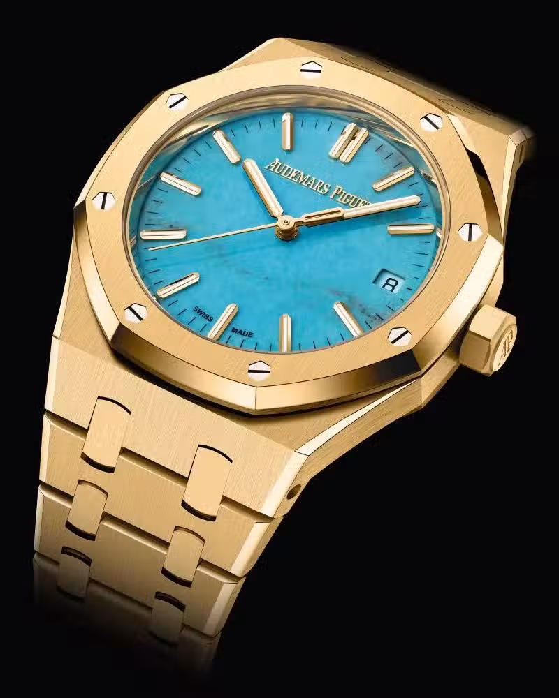 愛彼此次新推出了一款皇家橡樹37毫米的綠松石錶盤腕錶,綠松石是古老珍稀的寶石,三千多年前就已出現在古埃及與中國文化中。正因它擁有源遠流長的歷史背景,且色彩濃郁艷麗,因此一直是珠寶界尋尋覓覓的寶石。愛彼表精選原產於墨西哥的綠松石,首先需將石材切割成薄片,經過打磨、噴砂與拋光處理後,再固定於金色黃銅圓膜上,兩者厚度僅0.75毫米。由於每一塊綠松石的天然成分、紋理與色澤各不相同,加工處理後各自展現出不同的面貌,因此每一隻表面都是獨一無二之作。