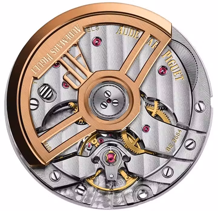 此款表搭載的是5900機心,具時分秒與日期顯示,厚僅3.9毫米,動力儲存達60個小時。機心內的22K玫瑰金自動陀,以及零件精緻的裝飾,如斜角拋光、霧面垂直打磨、日內瓦波紋、珍珠圓點打磨與倒角等,都可透過藍寶石水晶玻璃底蓋盡收眼底。