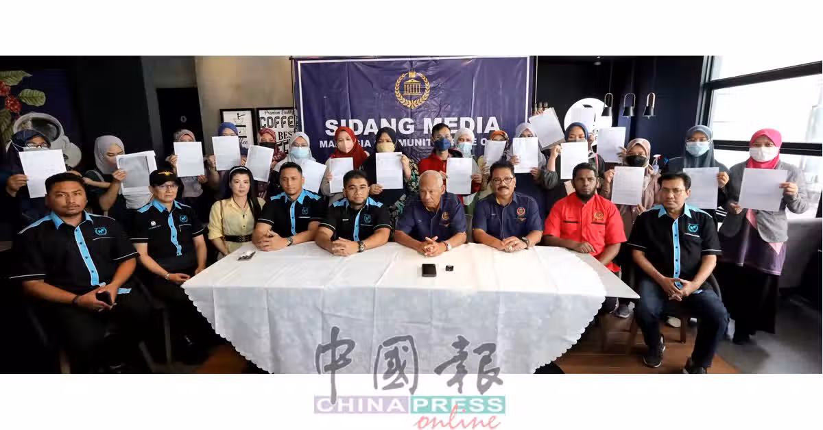 慕沙哈山(右4)和希山慕丁(右5)召開聯合記者會,幫助其中大約60名受騙者揭發該女老千的所作所為。
