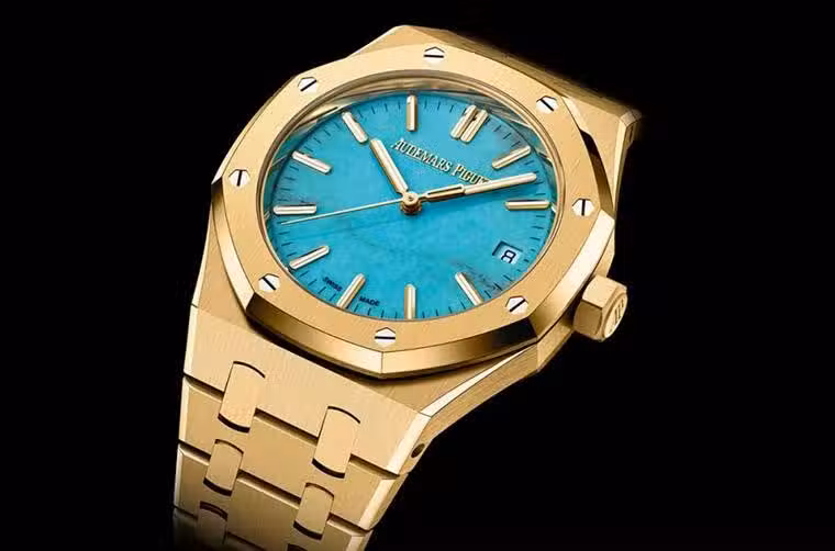 ▲愛彼在2023年新發表一款皇家橡樹自動三針錶,錶款的亮點除了黃金材質,還有面盤改採綠松石寶石,營造強烈視覺效果。
