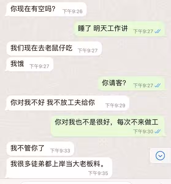 員工威脅老闆,若對他不好,就不放功夫給她,還稱自己的徒弟已經上岸當老闆。