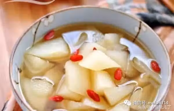 2.將3大碗水倒入煮鍋,煮沸後加入雪梨塊和枸杞。