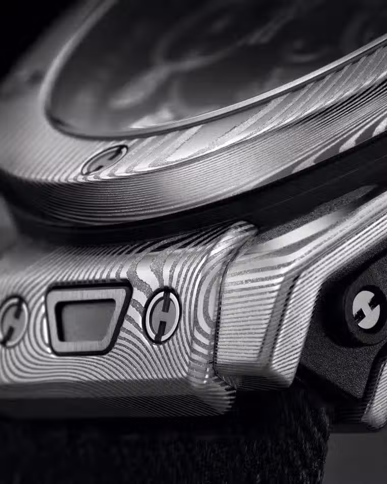 Big Bang Unico星廚計時碼錶所採用的大馬士革鋼材系出名門,為瑞典名家Damasteel特別打造,其焊接304L和316L兩種不同的鋼材,硬度在HRC 25~30之間,經過焊接鍛造及重復折疊超過100層後,再進行壓實處理,並通過專利粉末冶金及軋製扭轉,塑造出錶殼極具辨識度的莫列波紋。而為了讓大馬士革鋼材更契合手錶設計,品牌精心挑選出獨特花紋,需要透過冶金師傅以古老的手工工藝加上Damasteel®的創新技術,方能打造出手錶成品那種對比感強烈、色澤分明,紋路清晰的花紋,經由罕見材質的融入,使得一款宇舶Big Bang Unico計時碼錶瞬間耀眼奪目。
