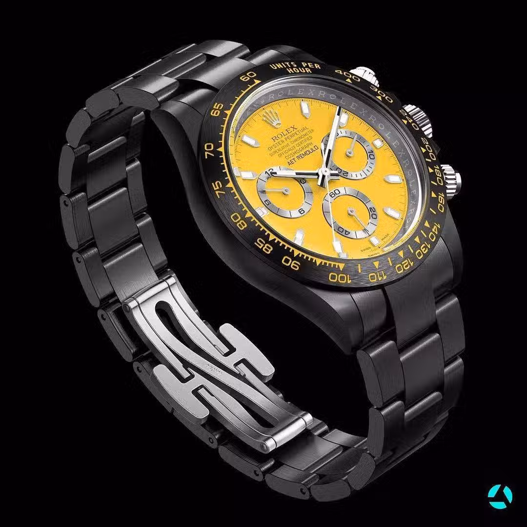 再來看另外一隻「Sakhir orange」腕錶,其同樣基於勞力士迪通拿打造,不同的是表盤和表殼運用了另一種色彩塗裝。顧名思義,這款腕錶的設計靈感源於F1的薩基爾賽道,該賽道最有名的特點是與沙漠毗鄰,而橙色的提取,則來自薩基爾賽道兩側的橙色路肩,意在呈現這一賽道的競速基因。