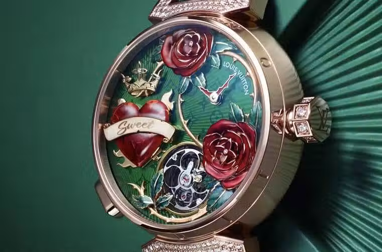 手錶面盤主要採用內填琺瑯與掐絲琺瑯兩種工藝呈現玫瑰花、藤蔓與葉片等圖案,其中皇冠與玫瑰圖案先交由雕刻大師Dick Steenman以手工精細雕琢而成,接著再由LV內部的琺瑯大師接力替圖案上色,無論內填或掐絲琺瑯,在製作過程一開始都是從粉狀的二氧化矽開始,然後要和不同的金屬氧化物結合以調配出各種顏色,例如面盤背景的綠色或玫瑰的紅色等,等到琺瑯大師在面盤塗上釉料後,就會放入溫度介於700°C~1,200°C的窯中燒製,每上一好一部分的釉料就要先燒製定色,如此反覆上色與燒製的過程,直到面盤圖案達到品牌設定的標準為止。