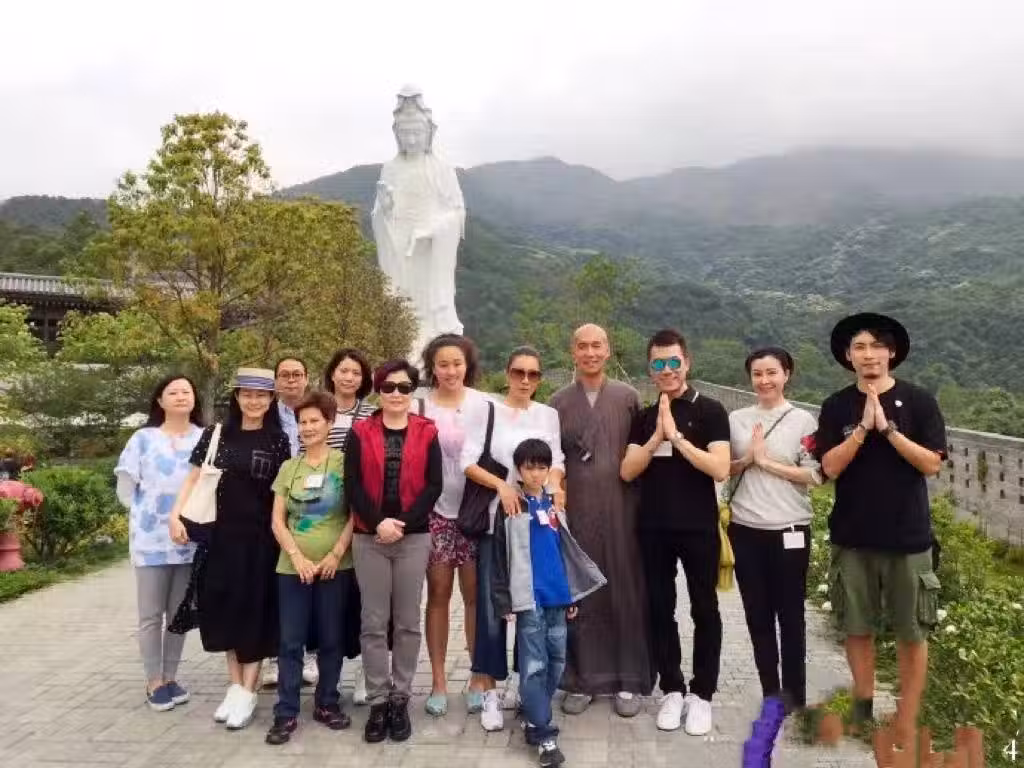 「英皇一姐」容祖兒曾於某年農曆四月初八佛誕日,帶著母親前往慈山寺禮佛,並和林偉亮合影。林偉亮身穿袈裟,目光平靜且有神。容祖兒和母親分站兩邊,雙手合十,虔誠且中滿敬意。