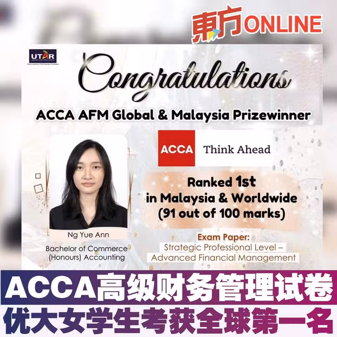 (吉隆坡10日訊)拉曼大學(優大;UTAR)工商與金融學院商學士(榮譽學位)會計學學生吳義涵在特許公認會計師公會(ACCA)戰略專業階段——高級財務管理(AFM)2023年6月份的試卷中考獲91分(總分為100分),排名全馬和全球第一名。
