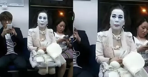 哇哦!!捷運驚現恐怖「白臉女子」,眼尖網友發現她脖子「1細節」後狂刷:快報警