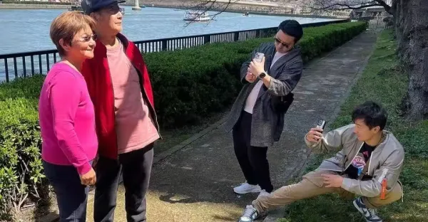 方力申一家出國旅遊為媽媽慶70歲生日,兄弟倆給父母不停拍合照,各種姿勢都出來像專業攝影師