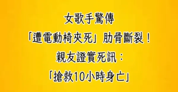 女歌手驚傳「遭電動椅夾死」肋骨斷裂!親友證實死訊:「搶救10小時身亡」