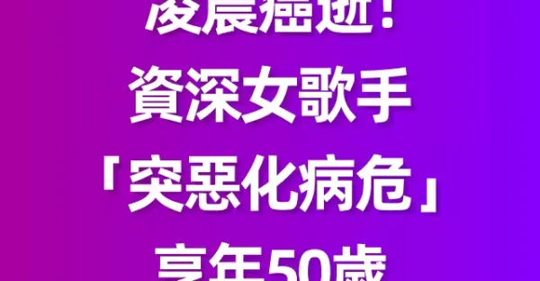 凌晨癌逝!資深女歌手「突惡化病危」享年50歲 昔勇敢「公開坎坷經歷」丈夫悲慟:趕去還是來不及