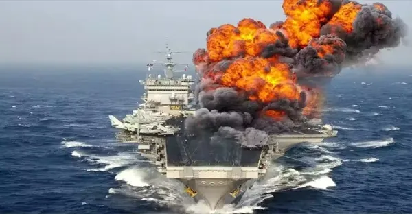一聲巨響,美軍航母被飛彈炸毀,以機場受損嚴重
