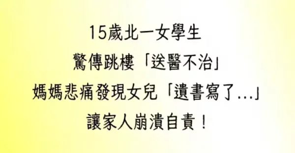 快訊/15歲北一女學生驚傳跳樓「送醫不治」! 媽媽悲痛發現女兒 「遺書寫了...」讓家人崩潰自責!