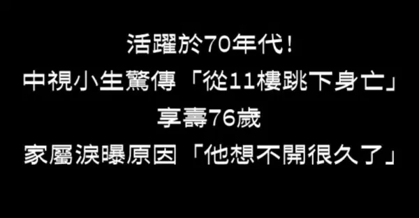 活躍於70年代!中視小生驚傳「從11樓跳下身亡」享壽75歲 家屬淚曝原因「他想不開很久了」