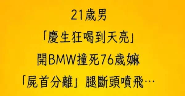 21歲男「慶生狂喝到天亮」開BMW撞死76歲嬤,「屍首分離」腿斷頭噴飛…