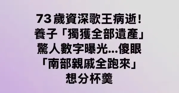 73歲資深歌王病逝!!養子「獨獲全部遺產」驚人數字曝光...傻眼「南部親戚全跑來」想分杯羹