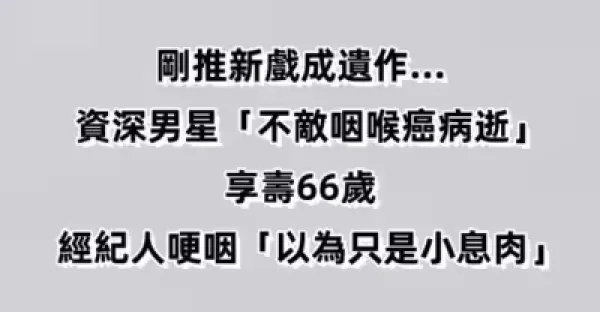 剛推新戲成遺作…資深男星「不敵咽喉癌病逝」享壽66歲 經紀人哽咽「以為只是小息肉」