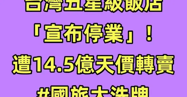 台灣五星級飯店「宣布停業」!遭14.5億天價轉賣... #國旅大洗牌
