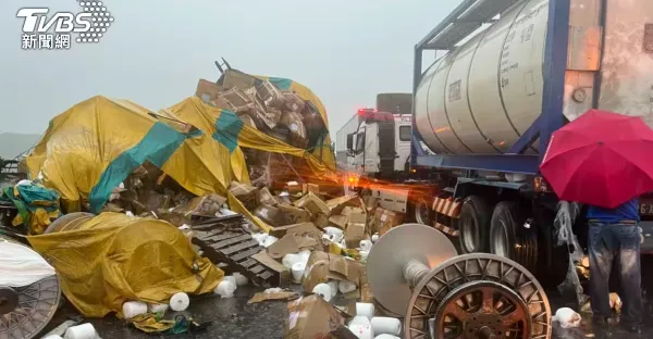 國3西湖段車禍!4車暴雨中連環撞 貨物散滿地一度塞爆