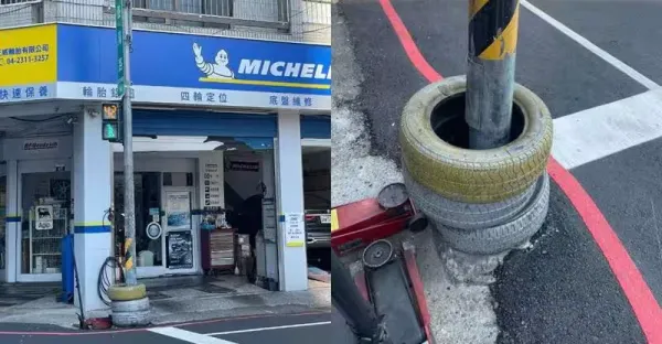 台中「紅綠燈套3輪胎」怎麼放進去?網友笑稱大仙施法 老闆解答了 30年已救2命