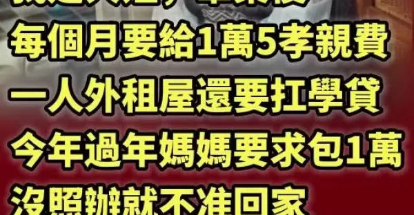 我是大姐,畢業後每個月要給1萬5來孝親費,一人外租屋還要扛學貸,今年過年媽媽要求包1萬,沒照辦就不准回家,結果這個月忘了匯款,手機竟傳來一封簡訊…真的笑哭了