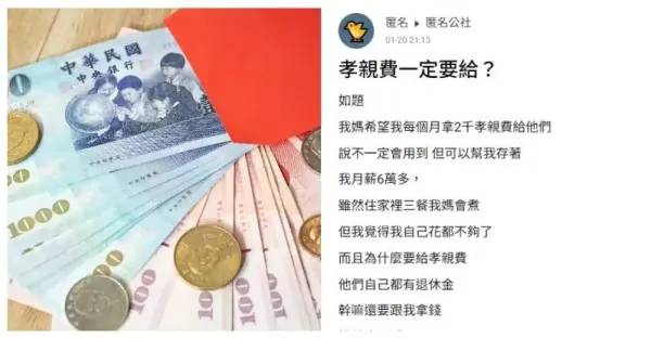 我月薪6萬多,吃住都在家裡,最近媽媽突然要我「每月給2千孝親費」,我自己花都不夠,為什麼要給?他們都有退休金,而且本來就有撫養義務,反正我覺得不需要...