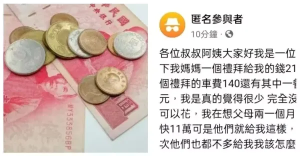 各位叔叔阿姨,我是一名高中生,爸媽每月收入快11萬,卻只給我每周210元零用,包括140元車資和外食一餐70元,我是真的覺得太少,講很多次他們都不多給... #確定是親生
