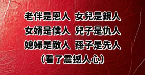 老伴是恩人,女兒是親人,女婿是僕人,兒子是仇人,媳婦是敵人,孫子是先人(看了震撼人心)!