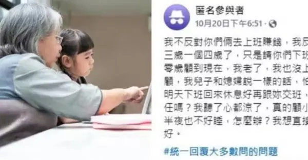兒子媳婦雙薪,把2娃丟給我顧,現在都3、4歲了,我老了也累了…要他們請保姆,但他們怕虐嬰什麼的,媳婦竟說:「顧孫不是婆婆的責任嗎?」我想離開這個家了