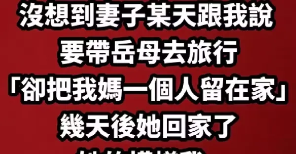 我和老婆婚後AA制已經5年,沒想到妻子某天跟我說,要帶岳母去旅行「卻把我媽一個人留在家」,幾天後她回家了,她的模樣我卻陌生到認不出來~