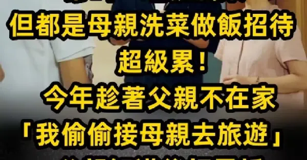 父親好面子、過年過節常叫一堆親戚來,但都是母親洗菜做飯招待,超級累!今年趁著父親不在家「我偷偷接母親去旅遊」 父親知道後打電話「大罵我不孝!」