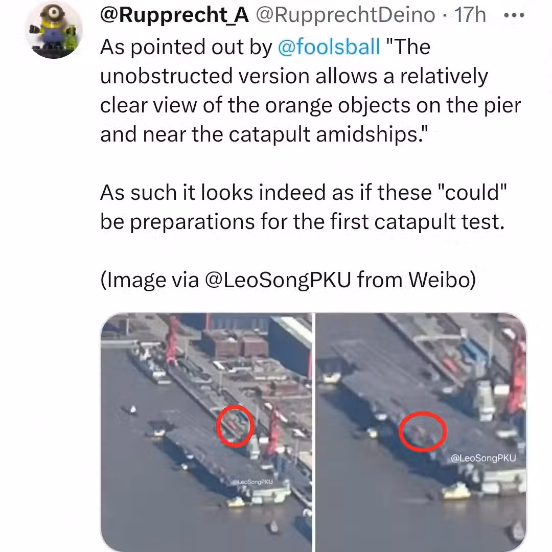 此外,魯普雷希特發現「福建」艦系泊的位置也有了變化,艦體並沒有平行並靠碼頭,而是艦首向旁邊平移了一段距離,這樣整個艦體是斜著停放的,這可能是為了進行彈射小車試驗時,保證安全距離。