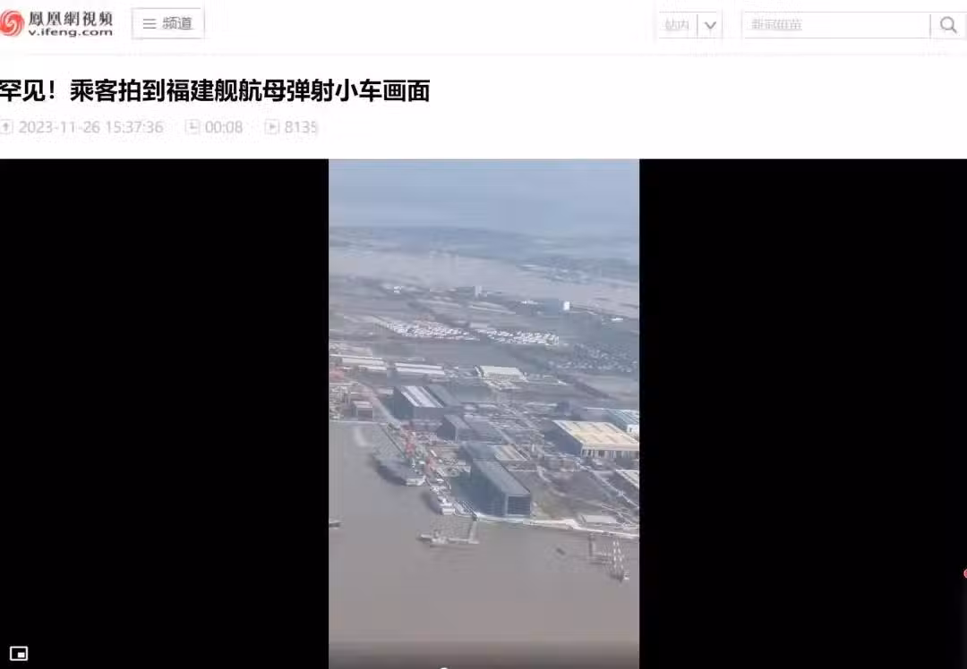 我國航母「福建」艦開始進行電磁彈射測試,全球第二艘電磁彈射型航母即將走向深藍。在11月26日,鳳凰網刊登了一段視頻,文字說明是「熱烈祝賀國產003型大型電磁彈射航空母艦福建號,彈射小車成功!這位坐航班的遊客運氣也太好了,剛好拍攝到小車落入水中濺起水花!」