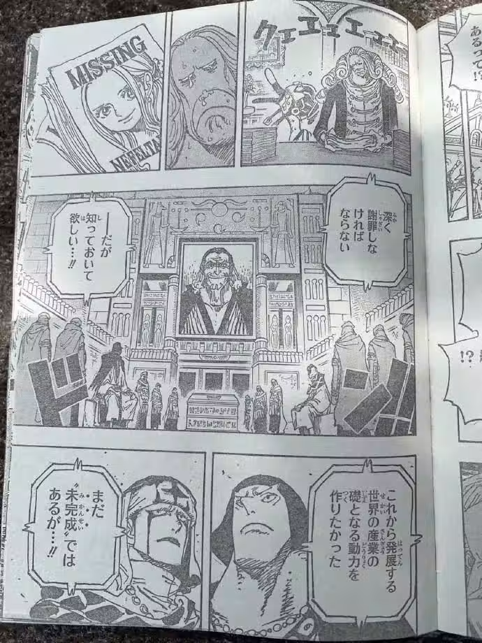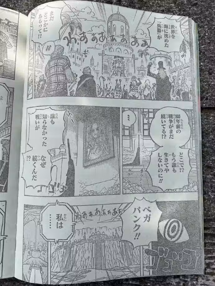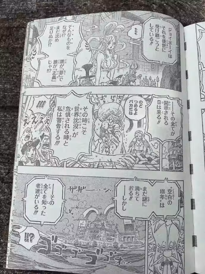 老貝說空白100年戰爭還沒結束,這句話把全世界搞懵了:800年前的人都沒了,戰爭怎麼繼續?為什麼要繼續?老貝沒有接著這個話往下說,也許他知道更多,但尾田不能讓他說下去,空白100年說到這裡該打住了,所以接下來老貝的話題,就轉移到了古代兵器上面。