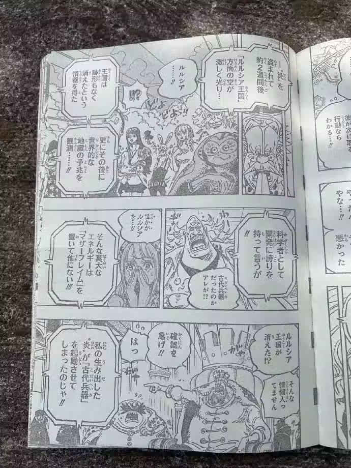 莫妲,也就是露露西亞那個牛奶妹,還有G2支部的古米爾中將,聽到這裡都很驚訝。這兩人都和艾斯有點​​關係,G2支部離露露西亞也不遠,原以為露露西亞滅亡是天災,沒想到是人禍。普羅甸斯王國,伊利札貝羅二世派人去露露西亞查看,他也是剛剛知道這個國家沒了。